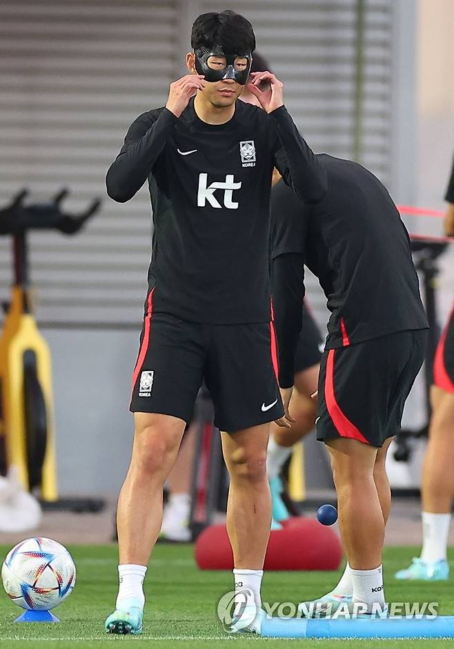 (도하=연합뉴스) 김도훈 기자 = 30일(현지시간) 카타르 도하 알에글라 훈련장에서 2022 카타르 월드컵 조별리그 3차전 포르투갈과의 경기를 앞둔 한국 대표팀 손흥민이 훈련을 위해 마스크를 고쳐 쓰고 있다. 2022.11.30