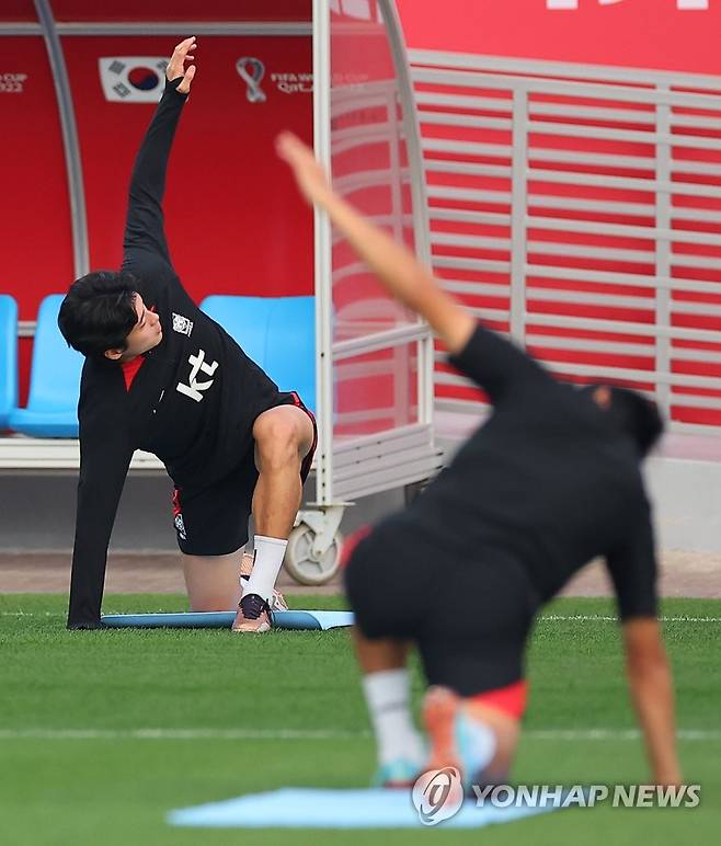 (도하=연합뉴스) 김도훈 기자 = 30일(현지시간) 카타르 도하 알에글라 훈련장에서 2022 카타르 월드컵 조별리그 3차전 포르투갈과의 경기를 앞둔 한국 대표팀 조규성이 스트레칭을 하고 있다. 2022.11.30