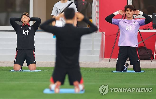 (도하=연합뉴스) 김도훈 기자 = 30일(현지시간) 카타르 도하 알에글라 훈련장에서 2022 카타르 월드컵 조별리그 3차전 포르투갈과의 경기를 앞둔 한국 대표팀 황흰찬(왼쪽), 송범근이 스트레칭을 하고 있다. 2022.11.30