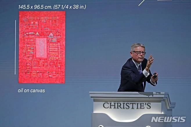[홍콩=뉴시스] 박진희 기자 = 크리스티 홍콩 '20·21세기 미술 이브닝' 경매사 유씨 필카넨(Jussi Pylkkanen)이 30일 홍콩 컨벤션 센터(HKCEC) 크리스티 홍콩 경매장에서 열린 '20·21세기 미술 이브닝 경매'에 출품된 한국 추상화가 고(故) 이성자(1918~2009) 작가의 작품 '무제'를 경매하고 있다. 작품은 269,837,120원에 낙찰됐다. 2022.11.30. pak7130@newsis.com