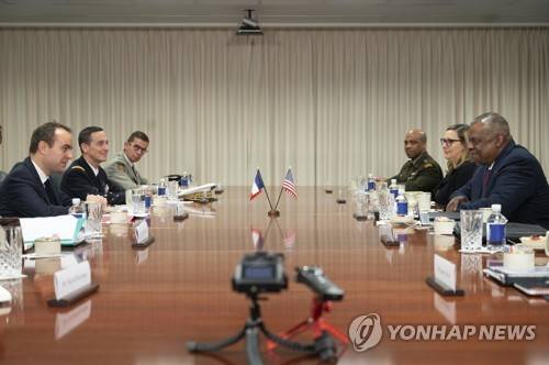 Defense Secretary Lloyd Austin, right, and French Minister of Armed Forces Sebastien Lecornu, left, talk during a meeting at the Pentagon on Wednesday, Nov 30, 2022 in Washington (AP Photo/Kevin Wolf)