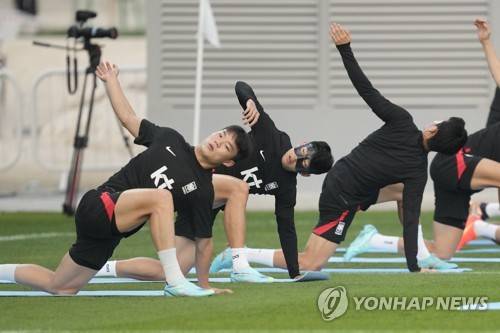 South Korea's Son Heung-min, center, warms up during a training session at Al Egla Training Site 5 in Doha, Qatar, Wednesday, Nov. 30, 2022. South Korea will play its third match in Group H in the World Cup against Portugal on Dec. 2. (AP Photo/Lee Jin-man)