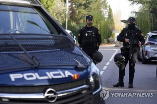 Police officers stand guard as they cordon off the area next to the Ukrainian embassy in Madrid, Spain, Wednesday, Nov. 30, 2022. Spain's Interior Ministry says police are investigating reports of a blast at the Ukrainian embassy in Madrid. The ministry says police were told an employee at the embassy was slightly injured handling a letter in what it described as "a deflagration." (AP Photo/Paul White)