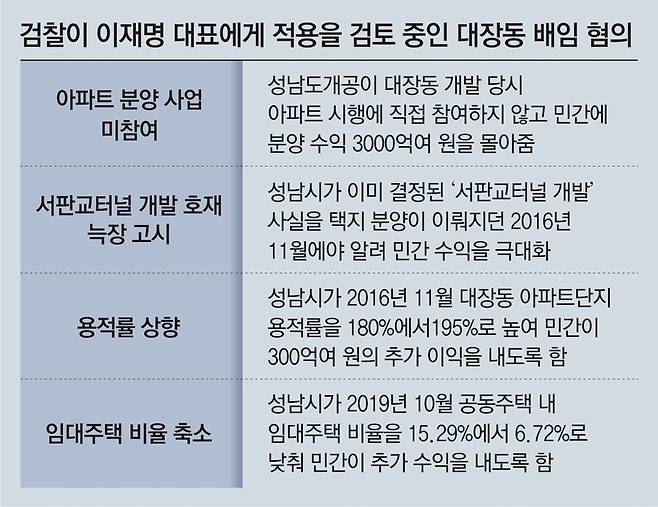 검찰은 대장동 민간사업자인 화천대유자산관리(화천대유)의 아파트 분양 독점, 서판교터널 계획 늑장 공개, 용적률 상향 및 임대주택 축소 등 성남시의 정책 결정 과정 곳곳에서 화천대유에 막대한 이익을 몰아주기 위한 작업이 진행된 것으로 보고 이 대표의 관여 여부를 수사 중이다. 또 검찰은 연내보다는 내년 초 이 대표를 불러 조사하는 방안을 염두에 둔 것으로 전해졌다.
