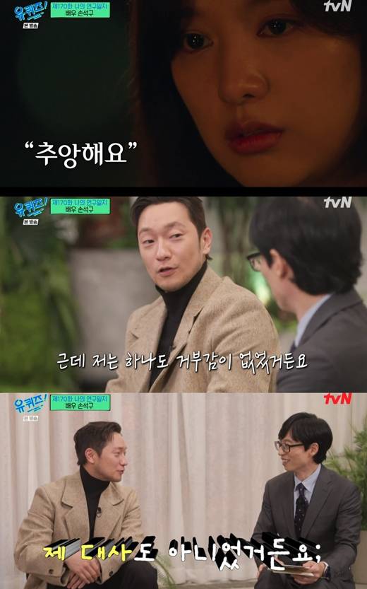 그러자 유재석은 "'추앙해요'라는 말이 유행할 때 하루에도 몇 번씩 듣지 않았느냐"라고 질문했다. 손석구는 "'범죄도시 2' 무대 인사할 때 마이크만 잡으면 '추앙합니다'로 시작해서 끝났다. 그런데 사실 내 대사도 아니었다. 지원이 대사였다"며 쑥스러운 듯 말했다.