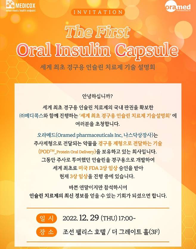 나스닥 상장사 오라메드 파마슈티컬스(Oramed Pharmaceuticals)는 12월 29일 조선 팔래스호텔에서 코스닥 상장사 메디콕스와 함께 '세계 최초 경구용 인슐린 기술설명회'를 개최한다.