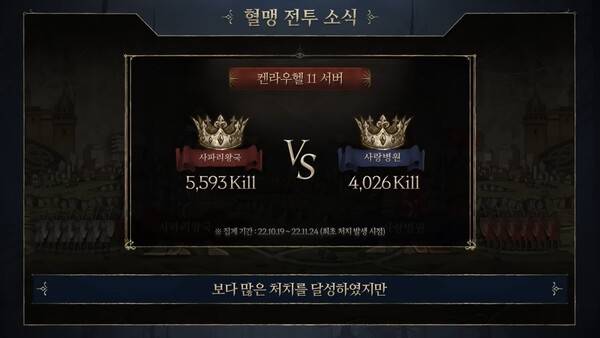 각 혈맹들의 경쟁도 눈여겨볼 만하다. 10월 월드 이전 당시 주어진 이권을 두고 많은 혈맹이 전투를 펼쳤다. 가장 치열했던 혈맹 전투는 켄라우헬11 서버 '사라피왕국' 혈맹과 '사랑병원' 혈맹 전투였다. 이 때 처치 수가 사파리왕국이 5593킬로 사랑병원 1764킬보다 훨씬 앞섰다. 하지만 10월 2일 첫 공성전부터 사랑병원 혈맹은 단 한 번도 수성에 실패하지 않았다.