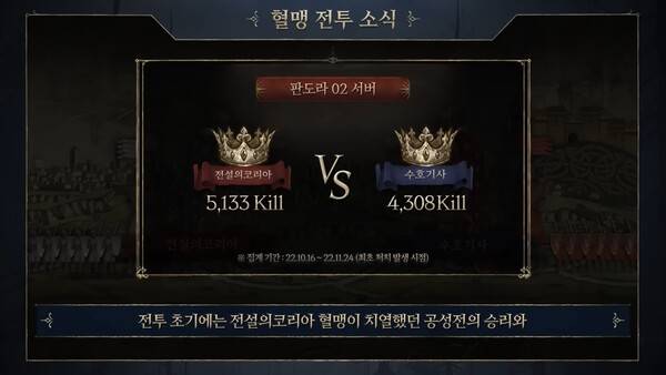 켄라우헬11 다음으로 치열했던 서버는 판도라02였다. '전설의코리아' 혈맹과 '수호기사' 혈맹 전투다. 전투 초기에는 전설의코리아 혈맹이 처치 수에서 우세한 모습을 보였다. 전설의코리아는 공성전과 주요 보스 쟁탈전에서 승전보를 울렸다.