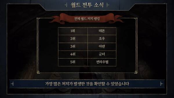 10월 월드 이전은 보다 많은 시간이 주어졌다. 그 결과 유저, 혈맹 간 전투가 더욱더 치열하게 펼쳐졌다. 엔씨의 설명에 따르면 가장 많은 처치가 발생한 월드는 '데몬'이다. 그 뒤로 조우, 아덴, 군터, 켄라우헬이 2~5위를 차지했다.