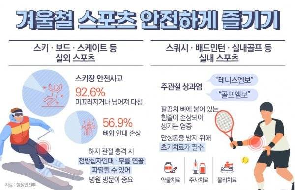 대표적인 것이 인기 겨울 스포츠인 스키이다. 행정안전부가 코로나19 전인 2019년 조사한 자료에 따르면 스키장의 안전사고 중 92.6%가 미끄러지거나 넘어져 다친 사고였다. 특히 이중 56.9%가 뼈와 인대의 손상으로 상해 부위별로 보면 팔과 손, 둔부와 다리, 머리와 어깨 순이었다.