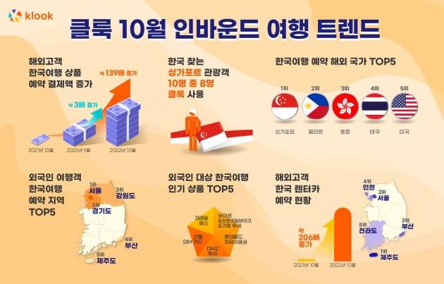 글로벌 여행 및 레저 이커머스 플랫폼 '클룩'은 10월 한 달간 해외 고객들의 한국 여행 예약 결제액이 작년 동기 대비 약 139배 증가했다고 밝혔다. 지난 9월과 비교해도 약 3배 증가한 수치다.