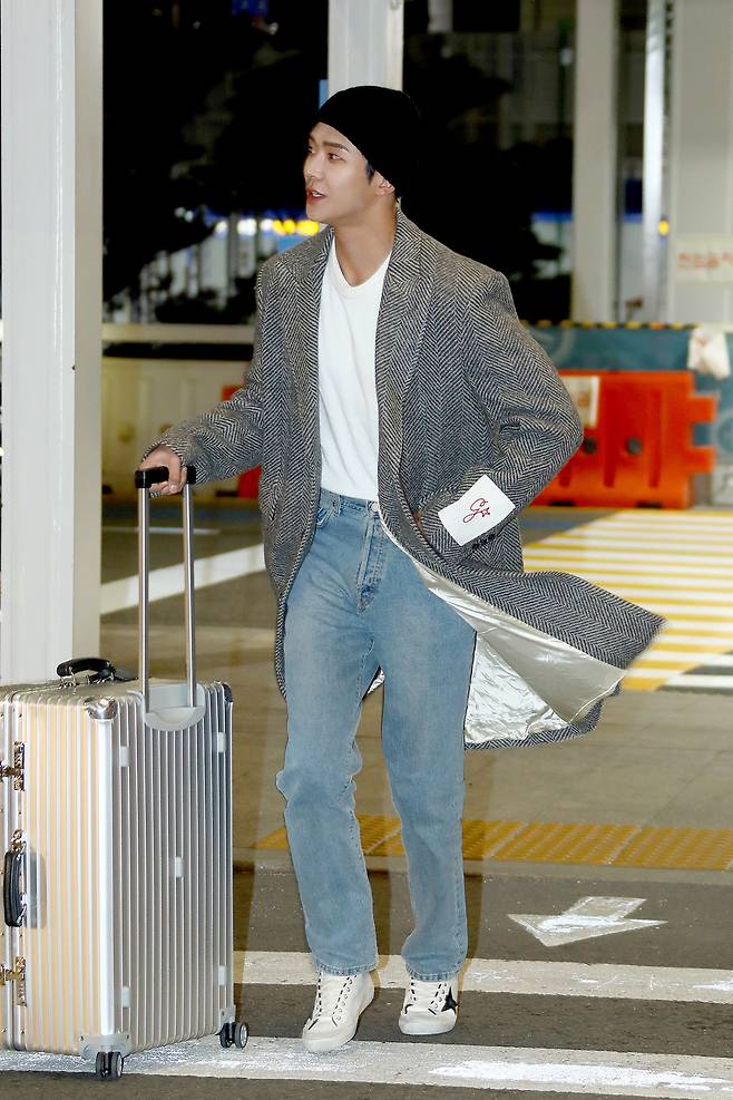 출국에 앞서 로운은 화이트 티셔츠와 데님에 골든구스의 클래식한 헤링본 코트를 매치해 깔끔한 스타일링을 선보였다.
