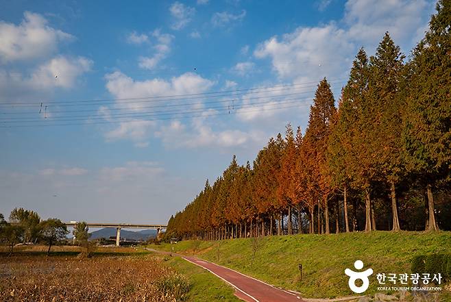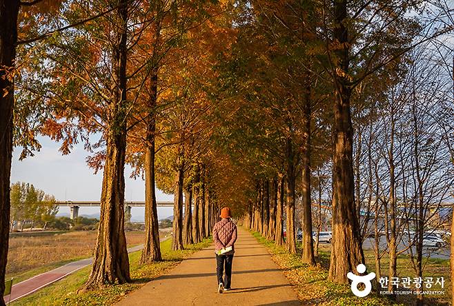단풍이 지기 전에 가장 서둘러 방문해야 할 곳을 꼽으라면 바로 이 곳, 공주 메타세콰이어 길이다. 주변에 조성된 강변 산책로와 억새풀숲도 충분히 아름답지만, 도착하자마자 탄성을 지르게 만드는 이 가로수길이야말로 가을 단풍과 찰떡처럼 어울리기 때문. 입소문이 난 명소다 보니 일몰 시간이 가까운 중에도 연신 사진을 찍는 관광객들이 눈에 들어왔다.