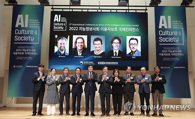 (서울=연합뉴스) 안형환 방송통신위원회 부위원장이 1일 서울 중구 페럼타워에서 열린 '제4회 지능정보사회 이용자보호 국제컨퍼런스'에서 참석자들과 기념 촬영하고 있다. 왼쪽부터 심홍진 정보통신정책연구원 연구위원, 권은정 정보통신정책연구원 부연구위원, 조장래 한국마이크로소프트 전무, 박남기 연세대 언론홍보영상학부 교수, 안형환 방송통신위원회 부위원장, 권호열 정보통신정책연구원장, 문미란 소비자시민모임 회장, 안준모 고려대 행정학과 부교수, 김정언 디지털경제사회연구본부장, 문정욱 지능정보사회정책센터장. 2022.12.1 [방송통신위원회 제공. 재판매 및 DB 금지]