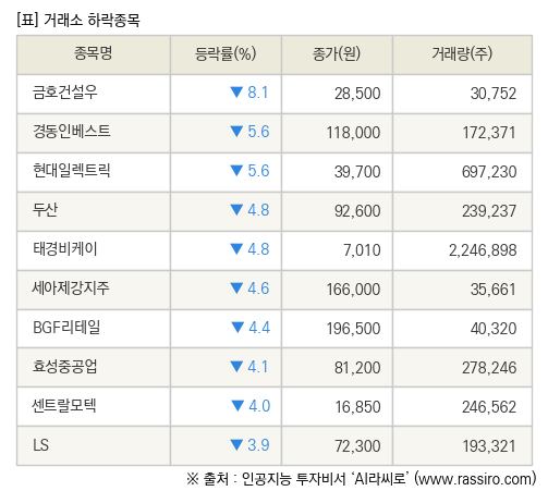 [fnRASSI]장마감, 거래소 하락 종목(금호건설우 -8.1% ↓)