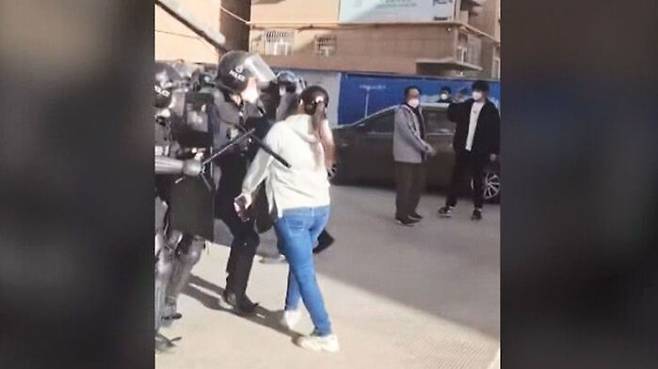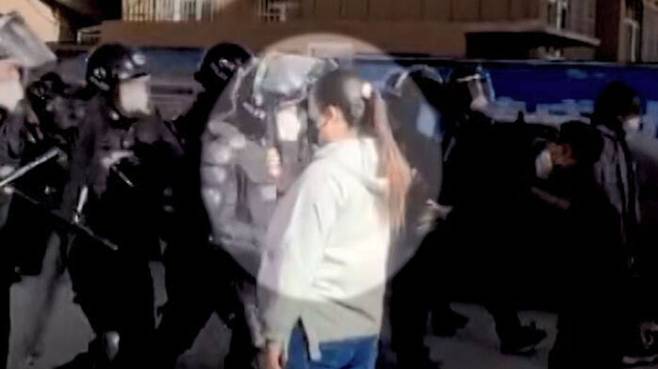 최근 중국에서 정부의 고강도 봉쇄 조치에 항의하는 시위가 전역으로 확산하는 가운데, 중국 신장 위구르 자치구에서 한 여성이 무장 경찰을 홀로 막아서는 모습이 눈길을 끌고 있습니다.