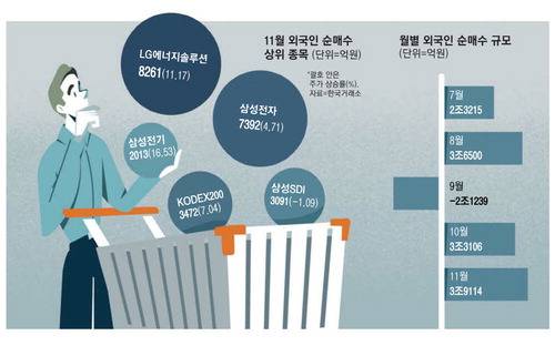 지난달 외국인들이 가장 많이 사들인 종목은 배터리 대장주인 LG에너지솔루션으로, 이 기간 8261억원을 순매수했다. 삼성그룹 대형주에도 외국인투자자들의 자금이 몰렸다. 삼성전자(7392억원), 삼성SDI(3091억원), 삼성전기(2013억원)가 다음으로 순매수 목록 상위에 올랐다. 순매수 규모 1위인 LG에너지솔루션에 투자한 외국인 투자자를 가정해보면 11월 한 달간 주가 상승률과 이 기간 달러당 원화값 상승폭(7.87%)을 고려했을 때 20%가량의 수익을 거뒀다.