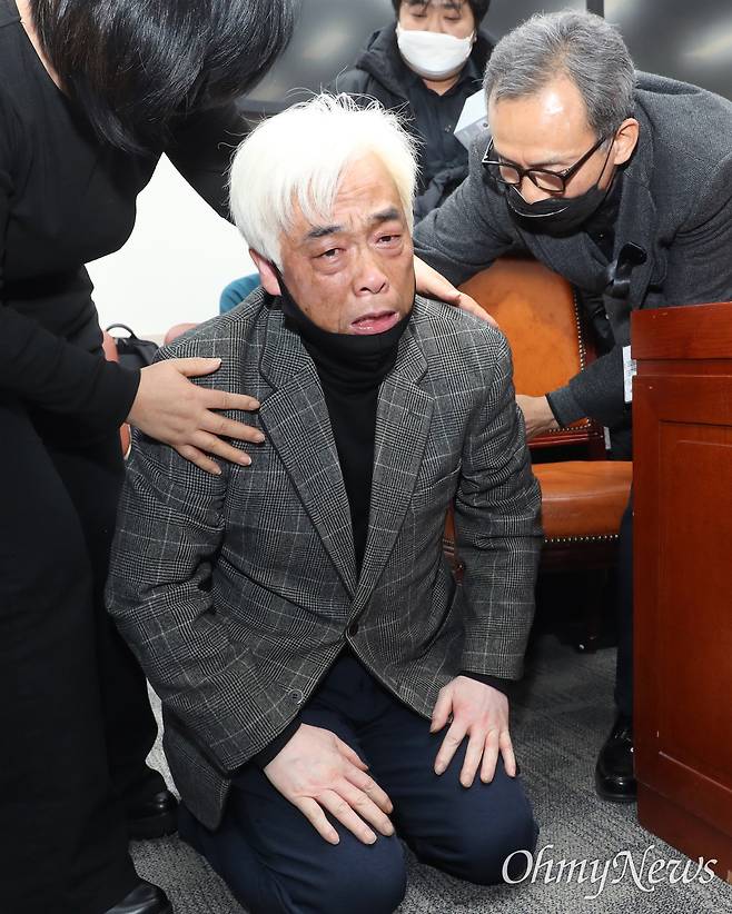 | ▲ 무릎꿇은 아버지... 부축하는 가족들 '이태원 참사' 희생자 배우 고 이지한 씨 아버지 이종철 씨가 1일 서울 여의도 국회를 방문해 국정조사특별위원장 등과 면담 도중 무릎을 꿇고 "우리 지한이, 억울하게 죽은 우리 아들... 진실을 밝혀주십시오. 부탁드립니다. 부탁드립니다. 이렇게 사정합니다. 제발 부탁드립니다. 이건 공정과 상식이 아닙니다."라고 말하며 울부짖고 있다. |