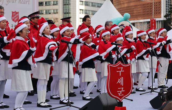 역사어린이합창단이 1일 서울 중구 서울광장에서 열린 '2022 구세군 자선냄비 시종식'에 참석해 축하공연을 하고 있다.