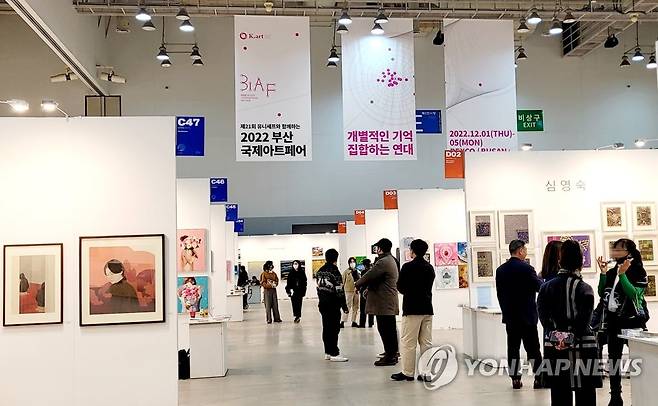(부산=연합뉴스) 조정호 기자 = 1일 부산 해운대구 벡스코 제2전시장에서 열린 부산국제아트페어에서 관람객들이 미술작품을 둘러보고 있다. 올해로 21회째를 맞은 부산국제아트페어는 '개별적인 기억, 집합하는 연대'를 주제로 한국, 일본, UAE, 인도, 몽골, 브루나이, 베네수엘라 등 9개국 국내외 작가 250여 명의 작품 3천여 점이 선보인다. 2022.12.1