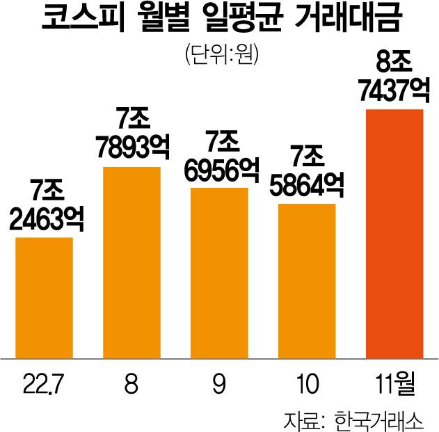 지난달부터 코스피 거래 대금은 회복하는 모양새다. 11월 일평균 거래 대금은 8조 7437억 원으로 집계됐다. 월별 거래 대금은 6월(8조 9092억 원) 수준을 회복했다. 일평균 거래 대금은 올해 1월부터 4월까지 10조~11조 원대에 머물다가 7월 7조 2463억 원 수준으로 급감했다. 이후 10월까지 4개월 연속 7조 원대에 머물렀다. 일일 기준 거래 대금은 5조 4762억 원(9월 6일)까지 하락하며 최저치를 기록하기도 했다.