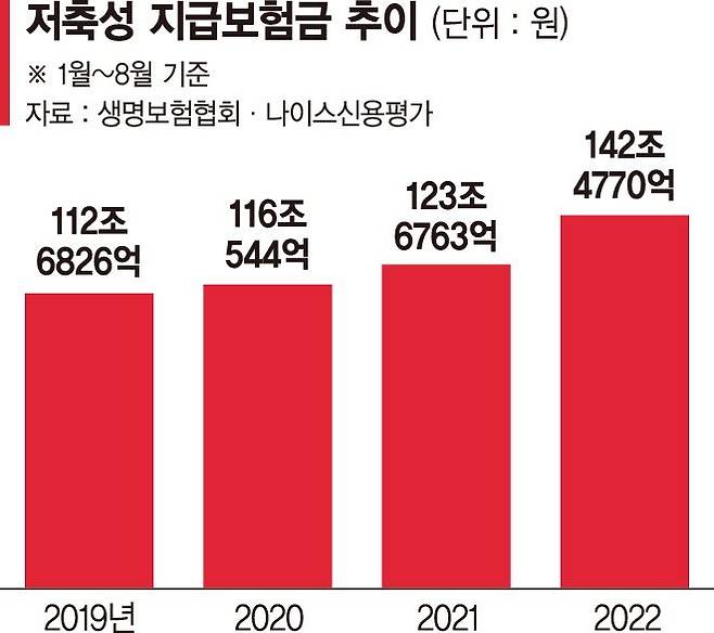 1일 금융투자업계에 따르면 올해 1~8월 생명보험사의 저축성 보험 지급보험금은 142조원에 이른다. 지난해 같은 기간(123조원)과 비교하면 20조원 가까이 늘었다.