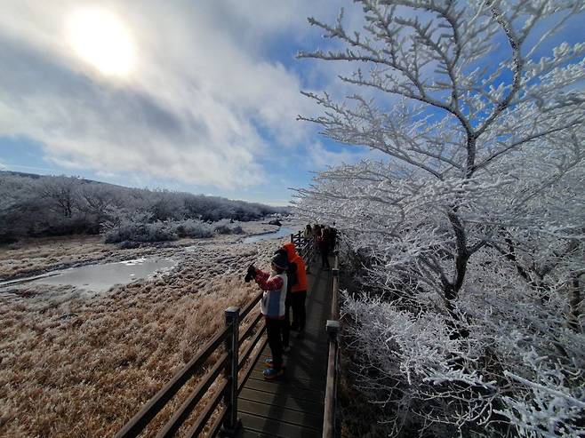 매서운 추위가 기승을 부리는 1일 제주 한라산 1100고지에 얼음꽃으로 불리는 '상고대'가 피어 장관을 이루고 있다. 상고대는 영하의 날씨에 대기 중에 있는 수증기가 나뭇가지나 바위 등에 얼어붙는 현상을 말한다.