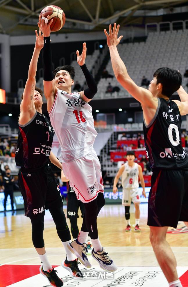 KGC 문성곤이 1일 수원KT아레나에서 열린 2022-23 KBL 수원KT와 안양KGC의 경기에서 김민욱을 따돌리며 레이업슛을 시도하고 있다. 2022.12.1.