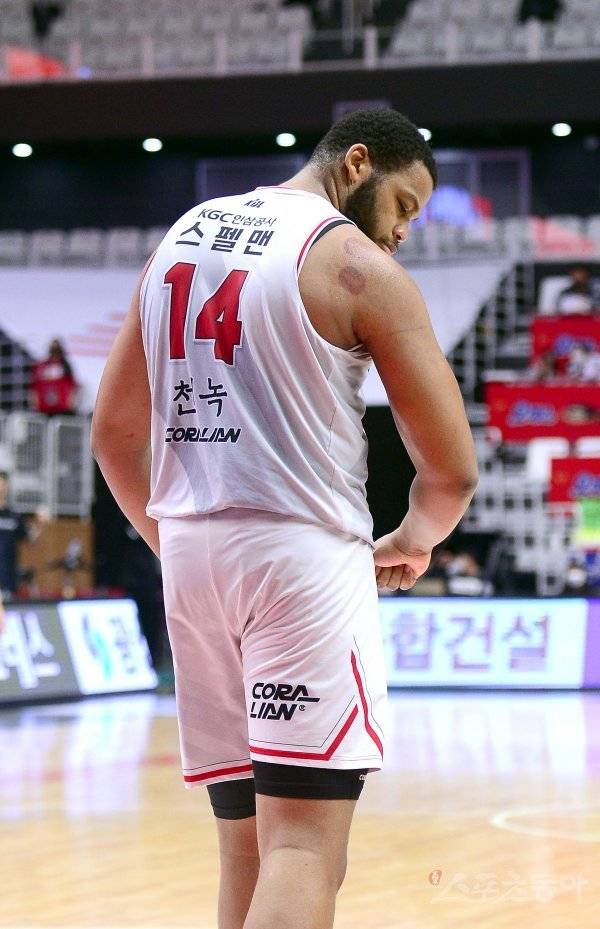 1일 수원 KT 아레나에서 열린 ‘2022-2023 프로농구’ KT와 KGC인삼공사 경기에서 KGC인삼공사 스펠맨이 골밑 슛을 성공시키며 추가자유투를 얻어낸 후 팔을 바라보고 있다.