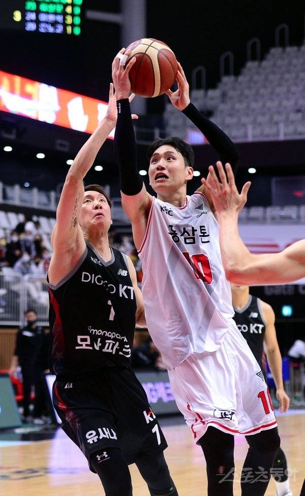 1일 수원 KT 아레나에서 열린 ‘2022-2023 프로농구’ KT와 KGC인삼공사 경기에서 KGC인삼공사 문성곤이 KT의 수비를 뚫고 골밑을 공격하고 있다.