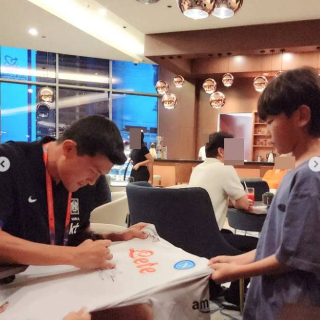 공개된 사진 속 아들 시안이는 김민재에 싸인을 받는 모습. 김민재는 부상 및 경기로 지쳐있음에도 프로다운 훈훈함을 자아냈다.