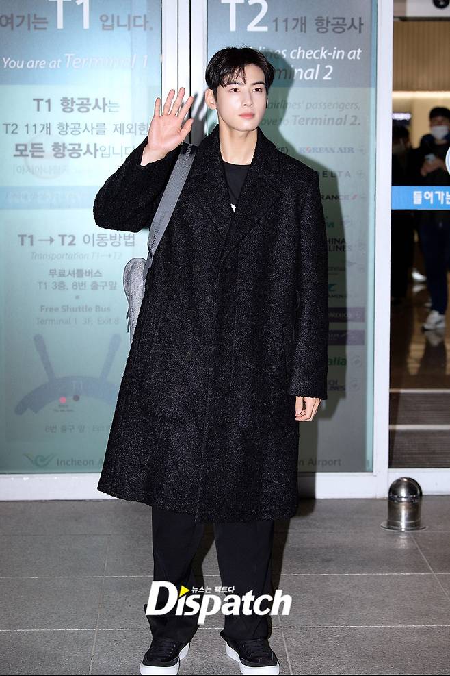 차은우는 이날 블랙 팬츠에 롱코트로 시크한 공항패션을 연출했다. 조각같은 비주얼이 돋보였다.