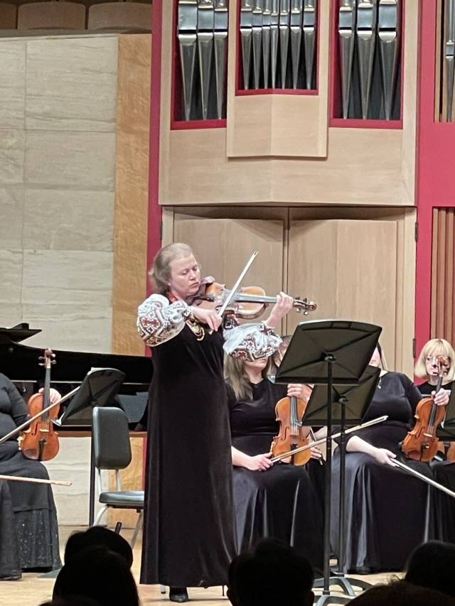바이올리니스트 프리훗코 안젤라(51)가 활을 켜자 그녀의 하얀 색 옷소매가 시선을 끌었다. 소매에 새겨진 우크라이나의 화려한 전통 문양인 비쉬반타는 활과 함께 역동적으로 움직였다.