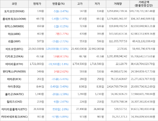 또한, 아이큐(-5.49%, 8.44원), 아이콘(-5.43%, 261원), 도지코인(-3.47%, 139원), 리플(-2.72%, 537원), 칠리즈(-2.67%, 219원), 이더리움클래식(-2.0%, 26,920원), 룸네트워크(-1.97%, 69.7원), 이더리움(-1.8%, 1,721,000원), 폴리곤(-1.59%, 1,240원), 위믹스(-0.15%, 650원)가 하락세를 나타냈다.