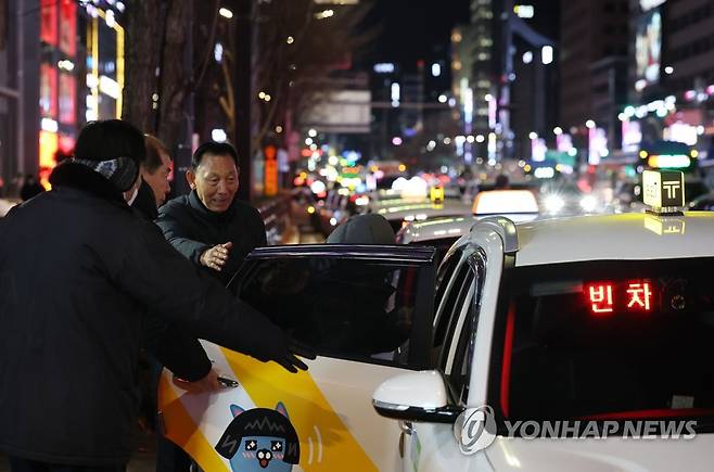 (서울=연합뉴스) 신준희 기자 = 1일 강남역 인근에서 서울시 직원과 택시 업계 관계자들이 시민들의 택시 탑승을 돕고 있다.