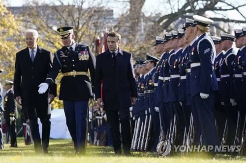 President Joe Biden and French President Emmanuel Macron review the troops with Col. David Rowland, commander of the 3rd U.S. Infantry Regiment, The Old Guard, during a State Arrival Ceremony on the South Lawn of the White House in Washington, Thursday, Dec. 1, 2022. (AP Photo/Andrew Harnik)