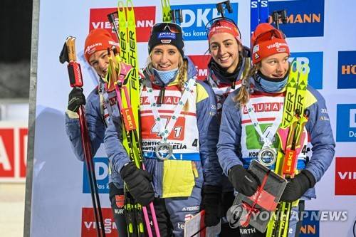 epa10341426 Team Germany celebrates on the podium after the women's 4x6km Relay race of the IBU Biathlon World Cup in Kontiolahti, Finland, 01 December 2022. EPA/KIMMO BRANDT