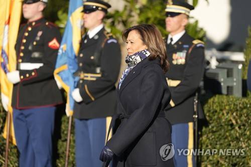 epa10341429 United States Vice President Kamala Harris attends a State Arrival ceremony honoring French President Emmanuel Macron and French First Lady Brigitte Macron on the South Lawn of the White House in Washington, DC, USA, 01 December 2022. EPA/CHRIS KLEPONIS / POOL