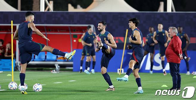 (알샤하니야(카타르)=뉴스1) 이동해 기자 = 포르투갈 축구대표팀 브루노 페르난데스 등이 1일 오후(현지시간) 카타르 알샤하니야 스포츠클럽에 마련된 훈련장에서 훈련을 하고 있다. 2022.12.1/뉴스1