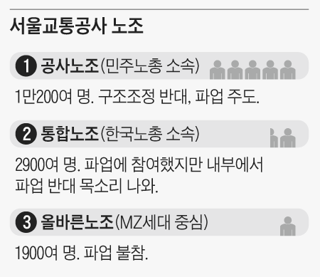 통합노조도 30일 파업에 참여하긴 했지만 내부에서 “파업 전선에서 이탈해야 한다”는 말이 나왔다. 한 관계자는 “통합노조 집행부는 공사노조에 끌려 들어갔지만 젊은 조합원을 중심으로 독자 행동을 해야 한다는 목소리가 높았다”고 했다. 젊은 조합원들 사이에선 “왜 우리를 무시하는 공사노조를 따라 파업에 뛰어들어야 하는지 모르겠다”는 불만이 나왔다고 한다. 노동계 관계자는 “연합교섭단의 한 축인 통합노조가 이탈하는 그림이 공사노조 입장에선 부담으로 작용했을 것”이라며 “파업 장기화를 막은 핵심 요인”이라고 분석했다.