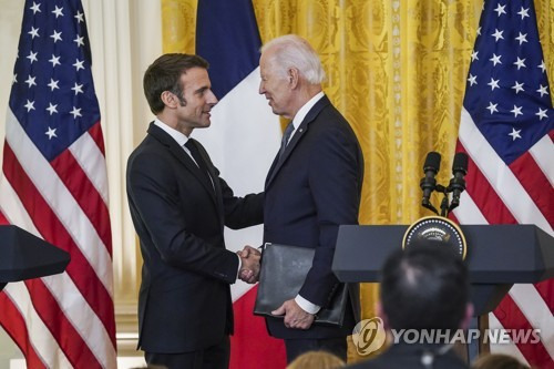 epa10342481 US President Joe Biden (R) and French President Emmanuel Macron (L) shake hands after speaking at a press conference in the East Room of the White House in Washington, DC, USA, 01 December 2022. Macron's visit marks the first official state visit of the Biden administration. EPA/SHAWN THEW