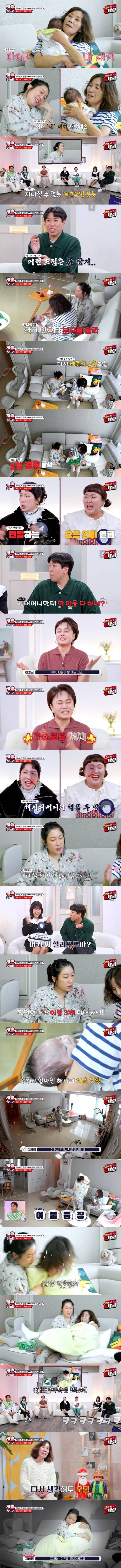 김영희는 계속 담요를 덮여주려는 시어머니에게 "친정엄마가 해서(딸)한테 이불 3개 덮여놔서 태열이 올라온 거다"라고 말렸다.