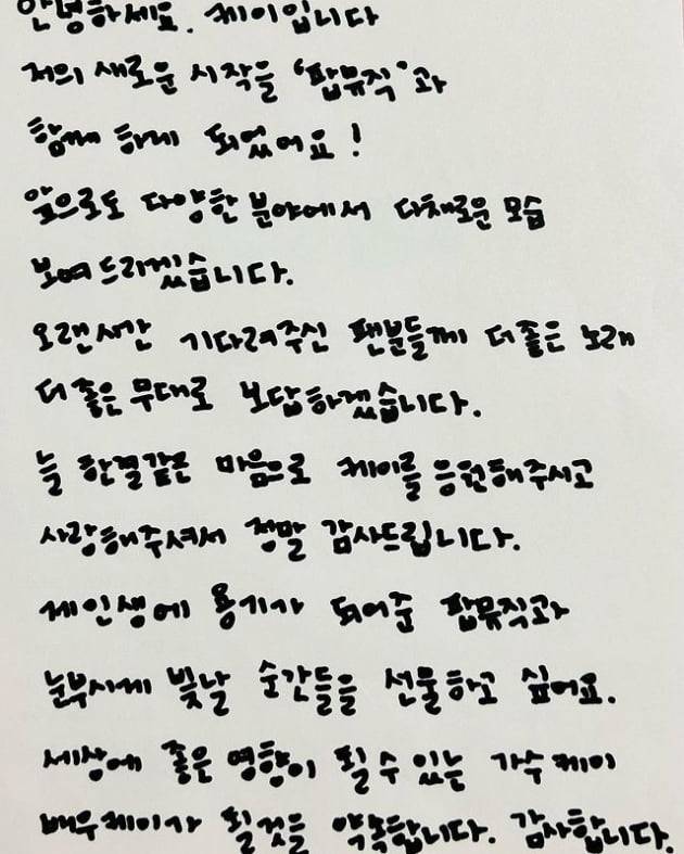 세상에 좋은 영향이 될 수 있는 가수 케이 배우 케이가 될 것을 약속합니다.