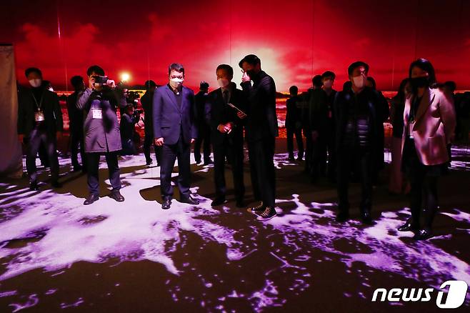 (인천공항=뉴스1) 민경석 기자 = 2일 인천국제공항 제1터미널 교통센터에 실감콘텐츠 미디어 전시관 'VIVID SPACE'가 문을 열었다. 이날 오후 개관식 참석자들이 전시 작품을 체험하고 있다.
