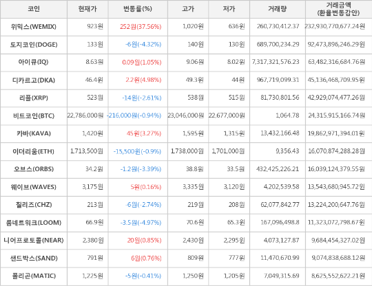 가상화폐 비트코인 -0.94% 하락, 위믹스 37.56% 상승