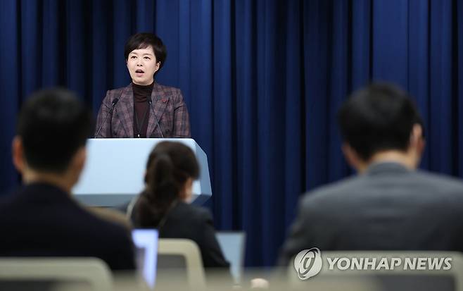 (서울=연합뉴스) 안정원 기자 = 김은혜 대통령실 홍보수석이 2일 오후 서울 용산 대통령실 청사에서 화물연대 파업 등 현안 관련 브리핑을 하고 있다. 2022.12.2