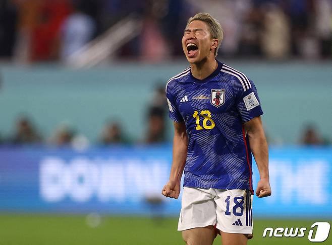 (도하 로이터=뉴스1) 권진영 기자 = 1일(현지시간) 카타르 도하 칼리파 국제 경기장에서 일본 국가대표팀의 아사노 다쿠마 선수가 주먹을 불끈 쥐고 승리를 만끽하고 있다. 이날 일본은 강팀 스페인에게 2:1로 승리하며 조 1위로 16강전 티켓을 따냈다.