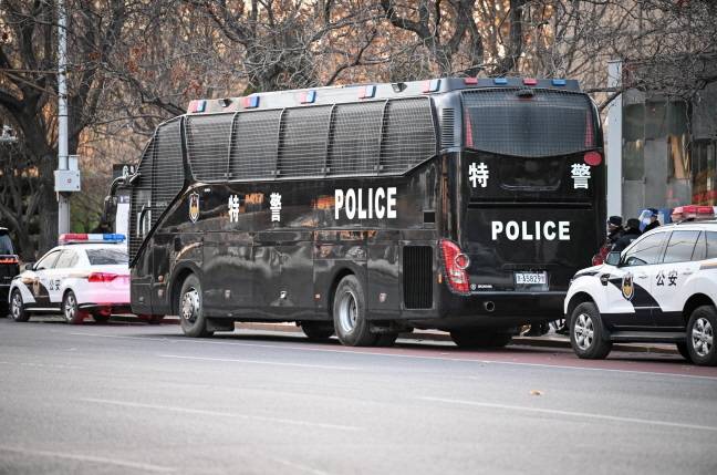 ['제로 코로나' 반대시위가 열렸던 베이징의 한 장소에 29일(현지시간) 경찰차량이 배치돼 있다. (베이징 EPA=연합뉴스)]