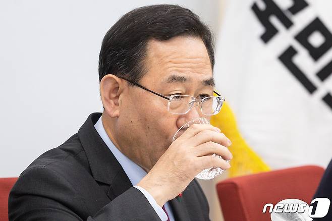(서울=뉴스1) 유승관 기자 = 주호영 국민의힘 원내대표가 2일 서울 여의도 국회에서 열린 김진표 국회의장 주재 여야 원내대표 4차 비공개 회동을 마친 후 기자간담회에 앞서 물을 마시고 있다. 2022.12.2/뉴스1