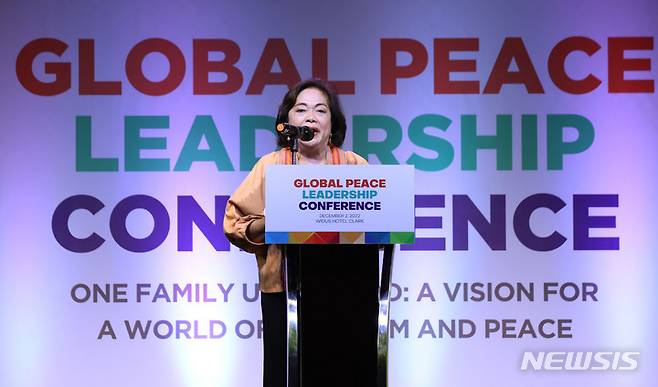 [클라크(필리핀)=뉴시스] 조수정 기자 = 아그네스 데바나데가 클라크 개발협력 회장이 2일(현지시간) 필리핀 팜팡가 클라크 위더스호텔에서 열린 '글로벌피스페스티벌 2022' 일환 글로벌 피스 리더십 컨퍼런스 개회 총회에서 환영사 하고 있다. 글로벌피스재단(GPF·Global Peace Foundation) 주최 '글로벌피스페스티벌 2022'는 12월 1일부터 3일까지 필리핀 클라크, 팜팡가에서 개최한다. 2017년 이후 5년만에 열리는 국제 평화 축제다. '자유롭고 평화로운 세계 실현을 위한 비전'을 주제로 정치, 경제, 시민사회, 청년이 주축이 된 시민주도 국가혁신 프로그램인 '서비스 러닝 프로그램'과 '글로벌 피스 페스티벌' 등으로 구성했다. 2022.12.02. chocrystal@newsis.com